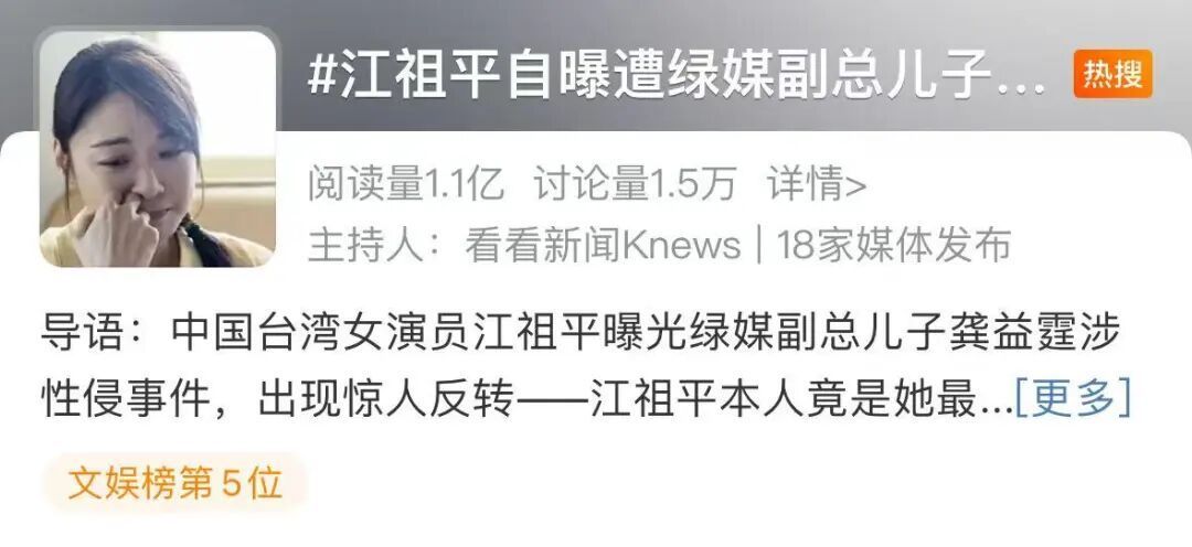 近日,中国台湾女星江祖平爆料一涉性侵事件,出现惊人反转——江祖平本人竟然就是她最初爆料中所称的受害女演员。